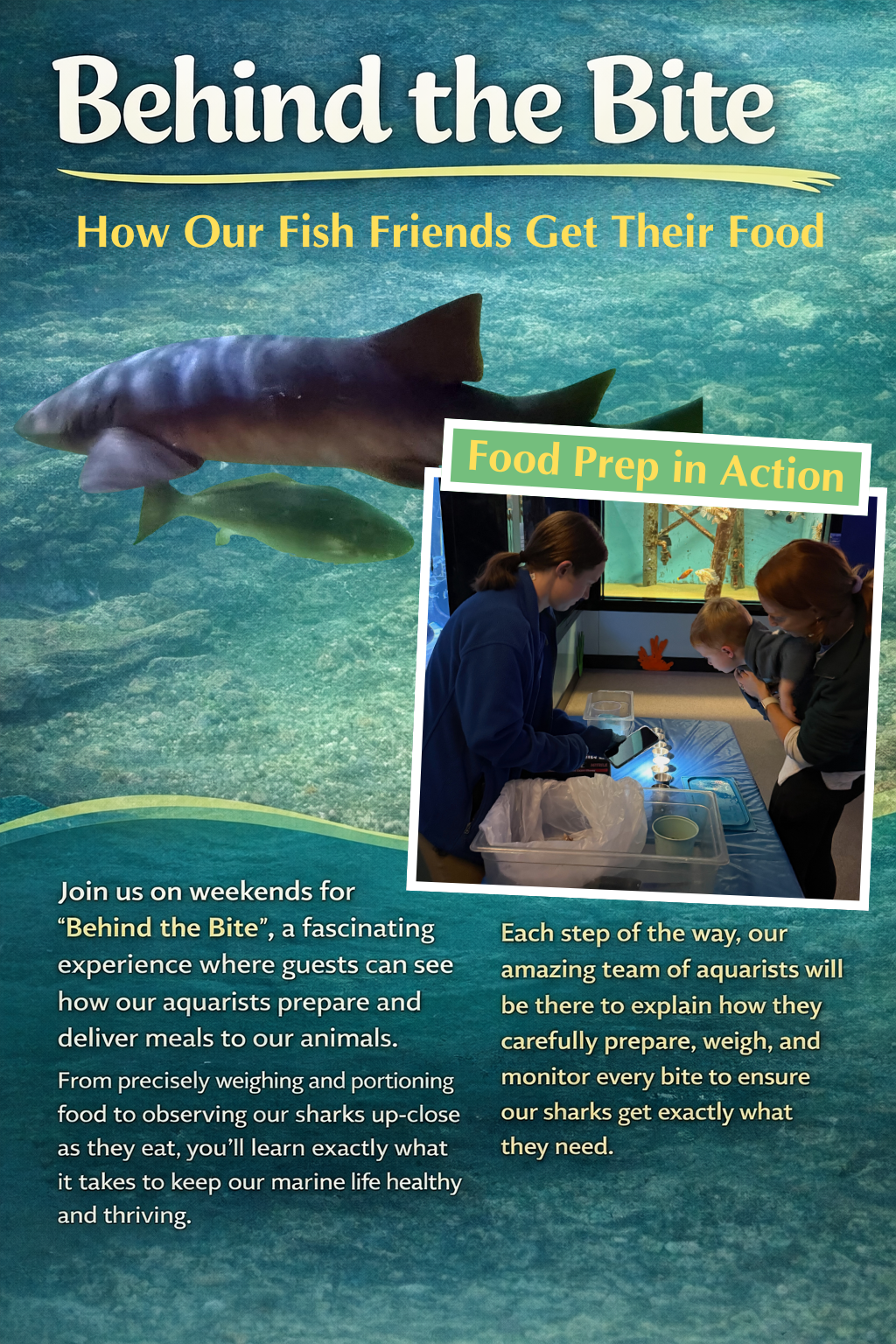 Join us on weekends for "Behind the Bite" where our friendly aquarist team members will show you a glimpse behind the scenes of what goes into feeding all our fish friends here at the aquarium. Watch how they cut, weigh, prepare, and deliver meals to each of our species of animals at the aquarium.