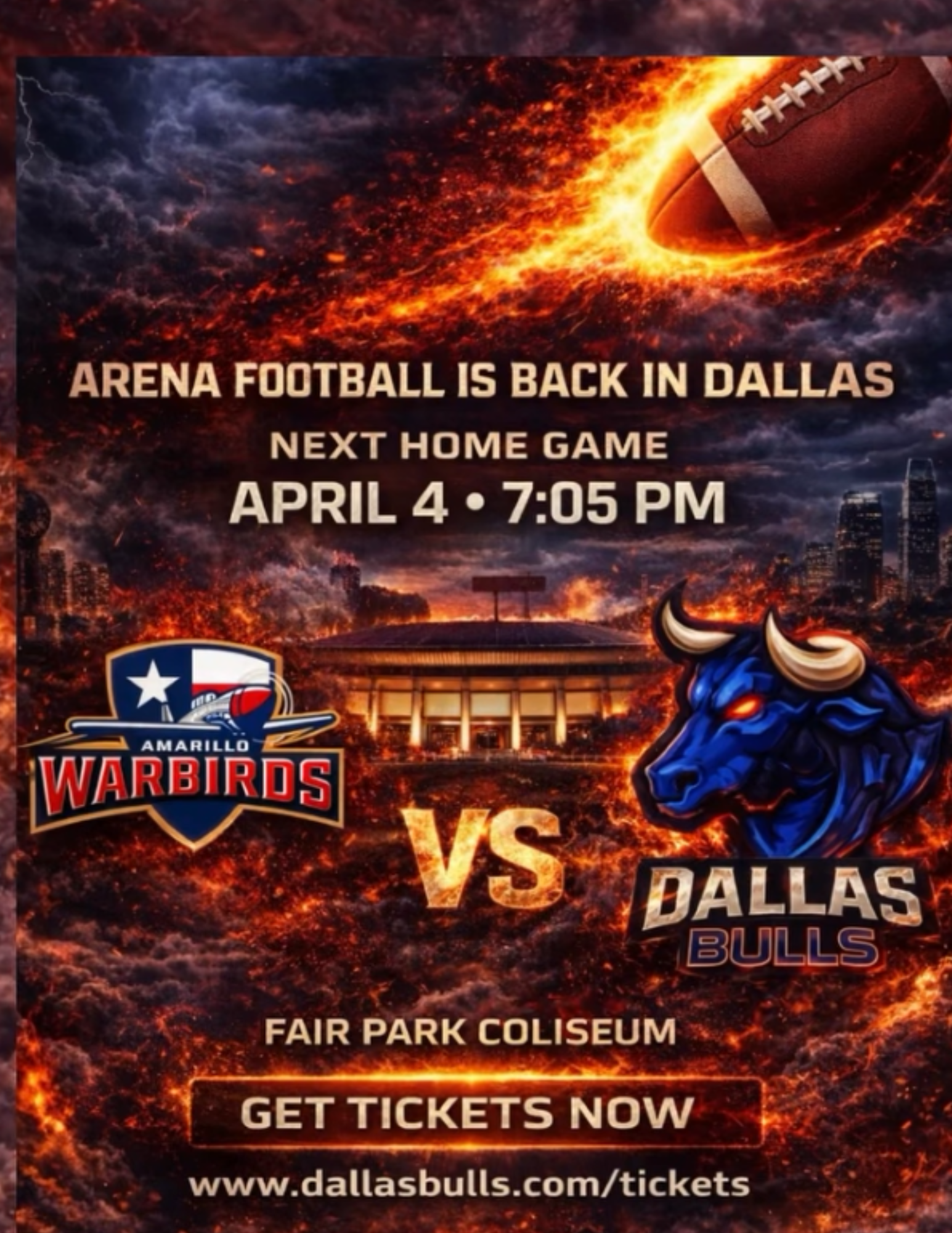 Get ready for fast-paced, high-energy action as the Dallas Bulls bring professional arena football to the historic Cotton Bowl Coliseum at Fair Park. Experience the excitement of indoor football up close, where hard hits, quick plays, and nonstop scoring keep fans on the edge of their seats.